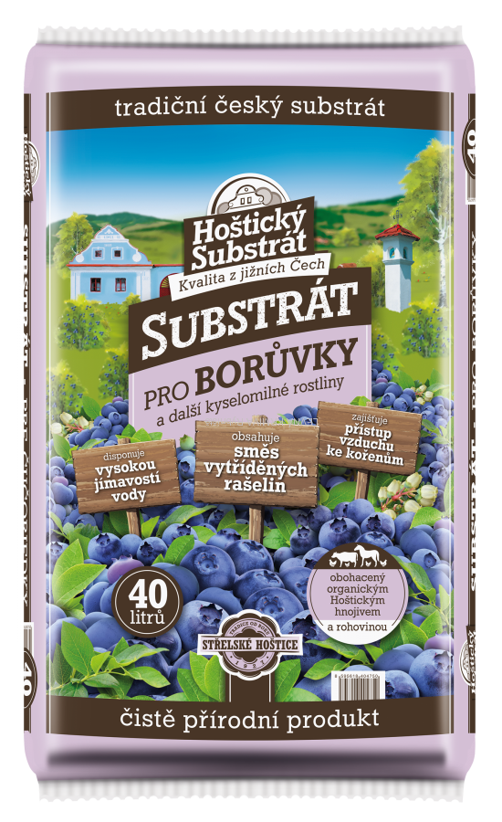HOŠTICKÝ SUBSTRÁT PRO BORŮVKY je vyroben ze směsi světlé a tmavé rašeliny s vhodnou kyselostí. K vyhnojení substrátu je použita kombinace organických hnojiv ve formě mikrogranulátu spolu s drcenou rohovinou. Substrát neobsahuje minerální (průmyslová) hnojiva.