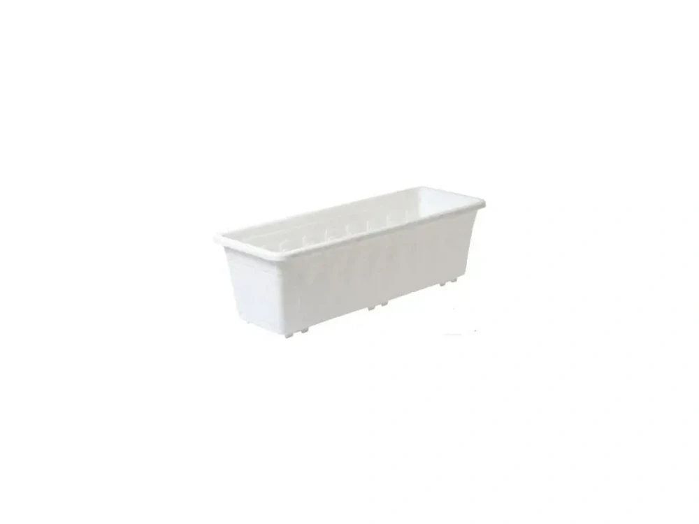 Plastový truhlík na květiny, pro lepší růst a snadnější zálivku se doporučuje provrtat dno pro odtok vody a kombinovat s miskou pod truhlík.