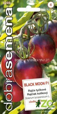 BLACK MOON F1 - nový chuťový standard ve "skutečně černých" rajčatech. Plody vynikají výtečnou chutí a křupavou texturou. Menší koktejlové plody o průměru 4 - 5 cm jsou mírně protáhlé a zrají z temně fialové do červené barvy s tmavým líčkem kolem stopky plodu. Tyčkové rajče s výborným zdravotním stavem.