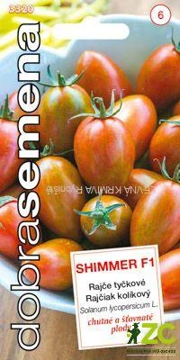 SHIMMER F1 - tyčkové rajče s netradičně zbarvenými, žíhanými plody oválného tvaru s výraznou špičkou. Plody jsou 30 ¦ 40 g těžké, odolné k praskání, ale současně příjemné k nakousnutí. Zdravé a bujné olistění, vysoký výnos. Odrůda je vhodná pro pole i pro pěstování ve fóliovnících a sklenících.