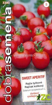SWEET APERITIF - asi nejsladší červené třešňové rajče, jaké jsme zatím chutnali. SWEET APERITIF je skutečně SLADKÝ. Tyčkové rajče s bohatými hrozny malých plodů. Plod je kulatý, dobře vybarvený, akorát k zakousnutí. Všechny "malé návštěvy", do 1,2 metru, které letos navštívily náš fóliovník se neomylně vydaly k této odrůdě. Dětem skutečně chutná. A nejen jim.