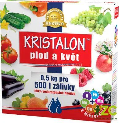 Kristalon Plod a květ je krystalické hnojivo, vodorozpustné a určené pro rychlejší start produkčního období rostlin. Podporuje vyšší násadu a vybarvení květů a plodů. Kristalon je univerzálně použitelný pro ovoce, zeleninu, okrasné rostliny včetně balkonových, ovocné stromy a keře, vinnou révu. Zamezuje žloutnutí listů.
