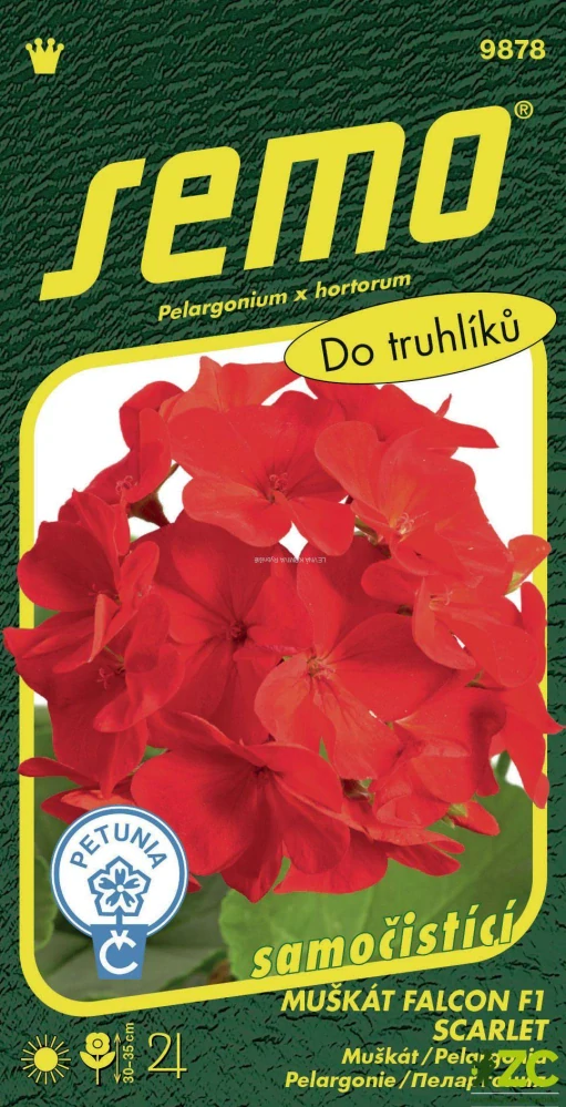FALCON F1 SCARLET (kód 9878) – revoluční odrůda muškátů pěstovaných ze semen. Rostliny jsou dobře větvené a kompaktní, bez květenství vysoké 25 cm (s květenstvím 35 cm). Květenství jsou pevná, o průměru 10–11 cm. Květy o velikosti asi 4 cm jsou jasně červené. Rostliny výborně snáší jak slunečné polohy, tak i polostín. Vhodné jsou do nádob, závěsných košů i záhonů. Ve velkých výsadbách získáte bohatě kvetoucí záhon, který díky samočistícímu efektu nepřestává kvést.