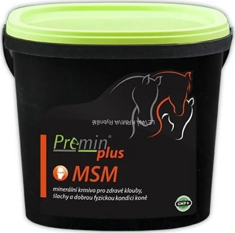 Premin® plus MSM se jako přirozená forma organické síry podílí na tvorbě základních aminokyselin methioninu a cysteinu, je důležitý pro tvorbu kolageních vláken, napomáhá eliminaci počínajících zánětů kloubů a šlach, zmírňuje alergické reakce a chrání organismus před negativními účinky volných radikálů, zvyšuje vitalitu organismu Pozitivně se projevuje při léčbě zánětu škáry a střelky kopytní. Zlepšuje kvalitu srsti. Zmírňuje bolesti svalů a kloubů. Premin® plus MSM je určen pro všechny kategorie koní zejména pro koně ve sportovní nebo dostihové zátěži.