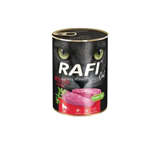 Mokré krmivo Rafi Cat s telecím masem je kompletní krmivo, které podporuje optimální tělesnou hmotnost a pohodu vašeho domácího mazlíčka. Obsahuje až 65 % telecího masa a živočišných produktů a je přirozeným zdrojem stopových a makroelementů, vitaminů, mastných kyselin a aminokyselin, jako je lyzin, methionin, fenylalanin a taurin, které jsou pro výživu koček nezbytné. Krmivo Rafi Cat je založeno na přirozených výživových potřebách koček a plně pokrývá potřebu složek nezbytných pro správné fungování organismu. Díky vhodně sestavené receptuře navíc kočka přijímá snadno stravitelné a kvalitní bílkoviny, které jsou hlavním zdrojem energie. Výrobek byl připraven odborníky na výživu zvířat a neobsahuje přidané obiloviny, konzervační látky ani barviva. Díky tomu je pro vaši kočku obzvláště chutné.