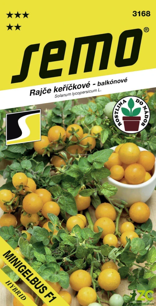 MINIGELBUS F1SM (kód 3168) – kolekce do nádob – velmi rané kompaktní rajče se žlutými kulatými třešňovými plody (15–20 gramů). Vhodné i do menších nádob. Výška rostliny je 20–30 cm v závislosti na velikosti nádoby.