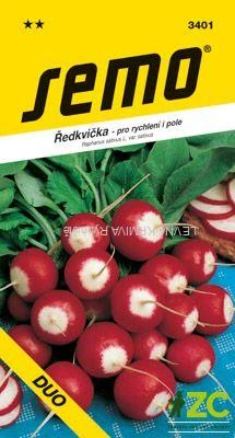 DUO - červenobílá, kulovitá až ploše kulovitá bulvička s převážně náhlým přechodem do středně silného hlavního kořínku. Povrch je hladký, v horních dvou třetinách šarlatově červený, ve spodní třetině bílý bez postranních kořínků. Dužnina je převážně narůžovělá, jemná, šťavnatá, nasládlá. Rostlina je slabě olistěná. Velmi raná ředkvička, hodí se pro rychlení i pro polní výsevy s intenzivní agrotechnikou. Odolná vůči vyšeptávání bulviček. Dobře se svazkuje. Jedna z nejranějších odrůd, vegetační doba je 31 – 35 dní.